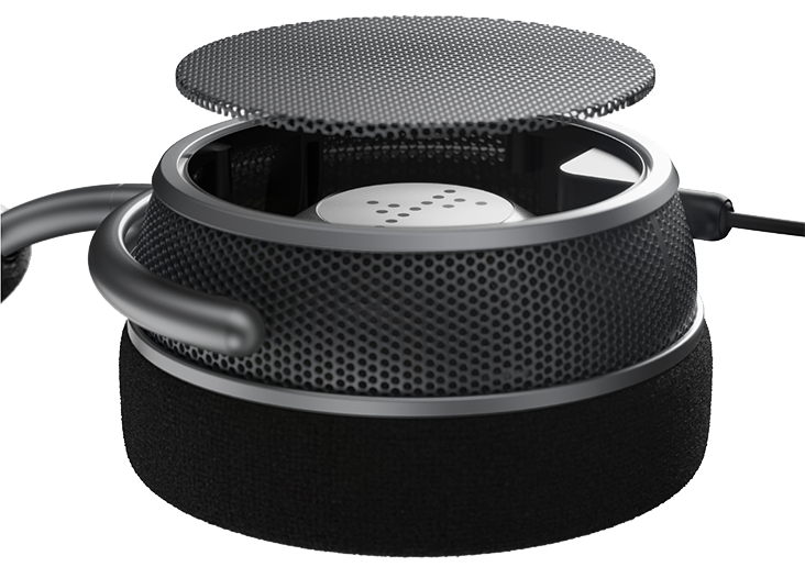 The head padding is made from breathable velour filled with high-quality memory foam. A combination of flexible polymer and a steel sheet spring precisely defines the clamping force. Inside the headband, two die-cast zinc sliders allow for size adjustment. A rotating joint connects to the yoke that holds the earcup and allows the headphones to fold flat for easier transportation.
