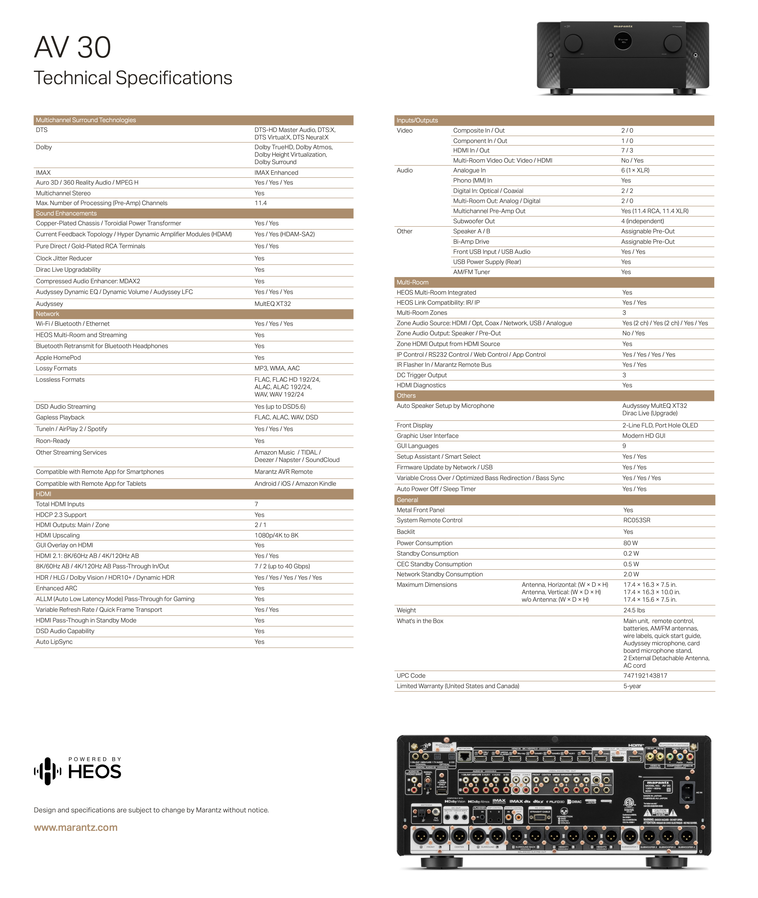 Equipped with the full Audyssey suite of advanced DSP algorithms, the AV 30 features Audyssey MultEQ XT32 automatic room acoustic correction. With the supplied measurement microphone, MultEQ XT32 analyzes each speaker's output (including the subwoofers) at up to eight measurement locations and generates precision digital filters that optimize each channel for the correct frequency and time domain response. Audyssey Dynamic Volume smooths out disruptive jumps in volume (such as TV commercials), letting you listen at lower levels while still enjoying clear dialog, music and sound. Audyssey Dynamic EQ provides full-range clarity at any listening level, and Audyssey Low Frequency Containment uses advanced psychoacoustic algorithms to deliver a full-range balance, including deep bass, without disturbing neighbors or people in other rooms of your home. Audyssey Sub EQ HT provides individual DSP tailoring of each subwoofer in a dual subwoofer setup for deeper bass with improved definition. Plus, the Audyssey MultEQ Editor app lets you view and adjust settings for detailed tuning and customize the sound more precisely to your room and tastes, and is available for purchase in iOS App and Google Play stores.