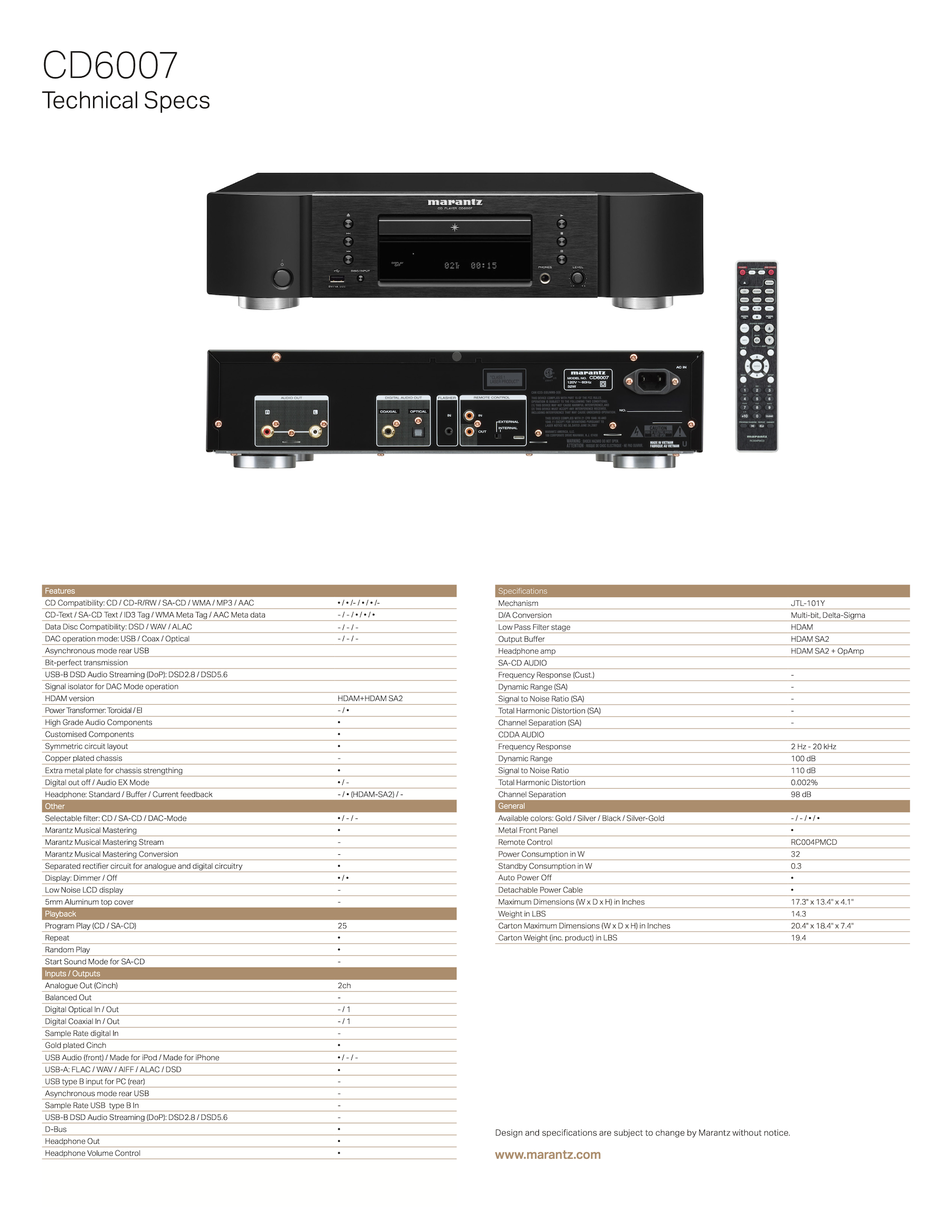 Rigid feet further eliminate unwanted vibration while the oversized low noise power supply feeds the digital and analog circuitry of the player. The new, high-quality DAC along with 2 selectable filter options converts digital signals to analog, this is then ‘pushed’ to the gold-plated synch outputs by Marantz’s proprietary small signal amplifier, the HDAM-SA2. In addition, we have included a new remote that also controls the PM6007 amplifier. The CD6007 features a newly-developed, complex headphone amplifier with a headphone amp gain setting to also accommodate a wide range of headphones.