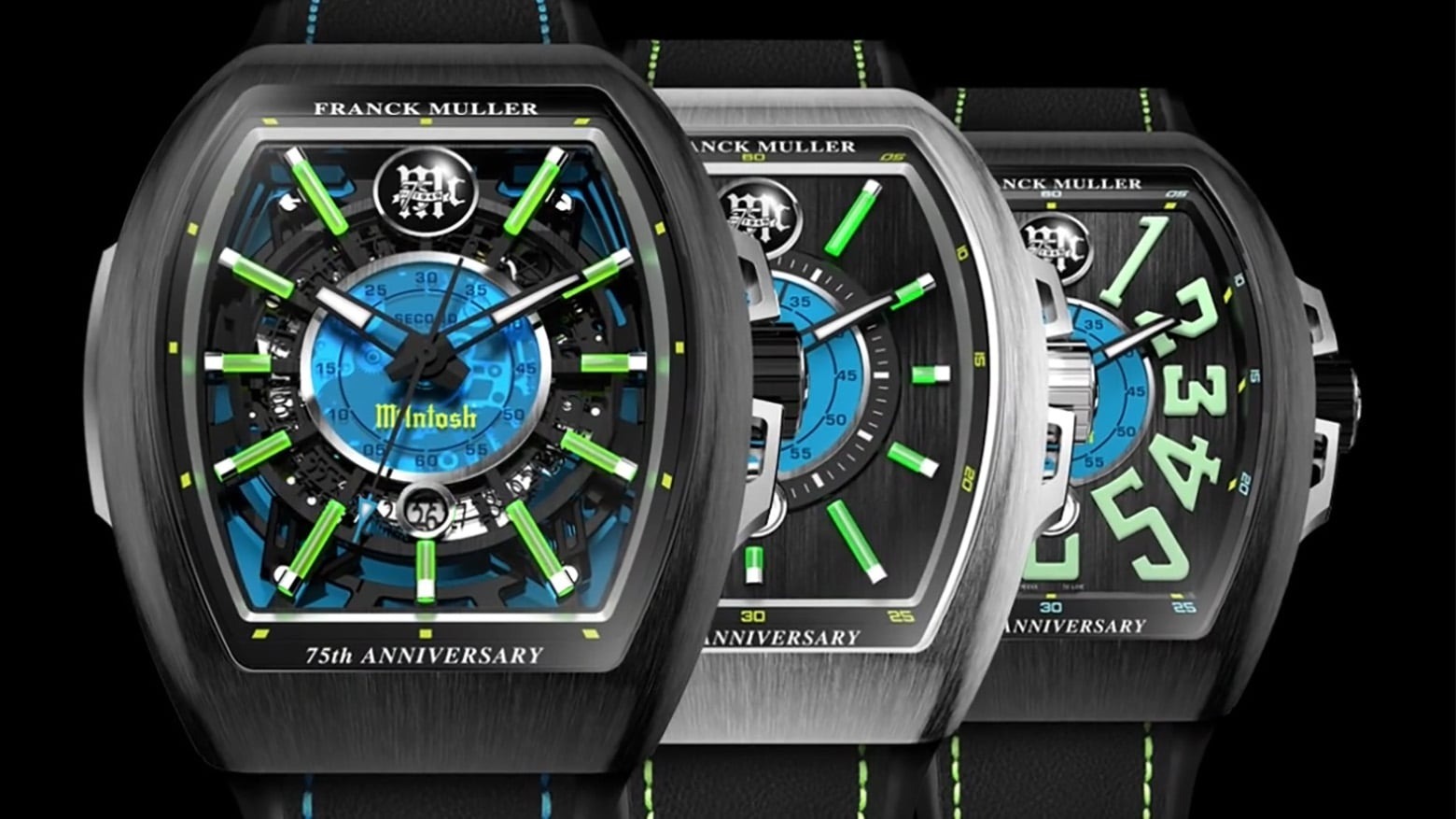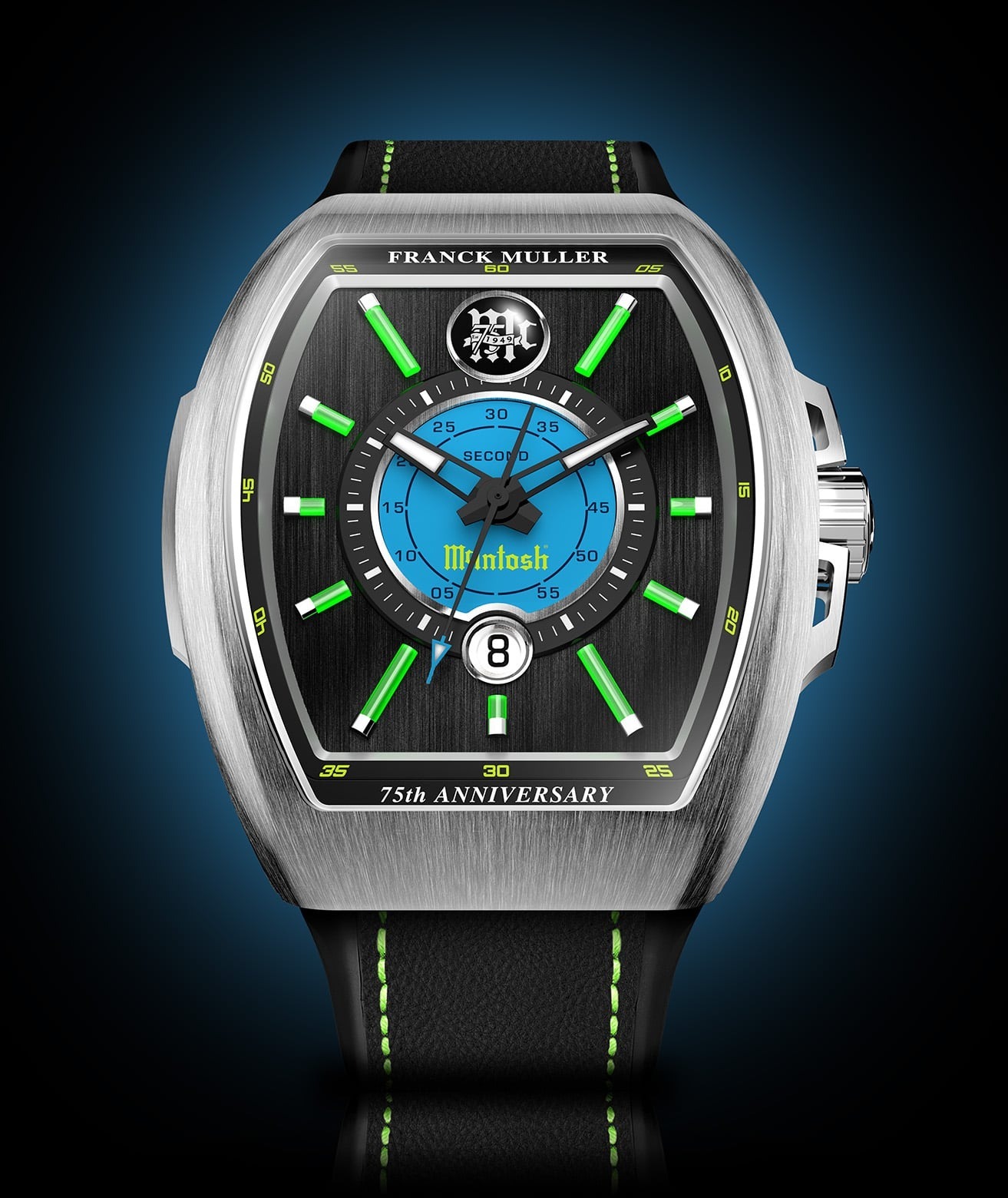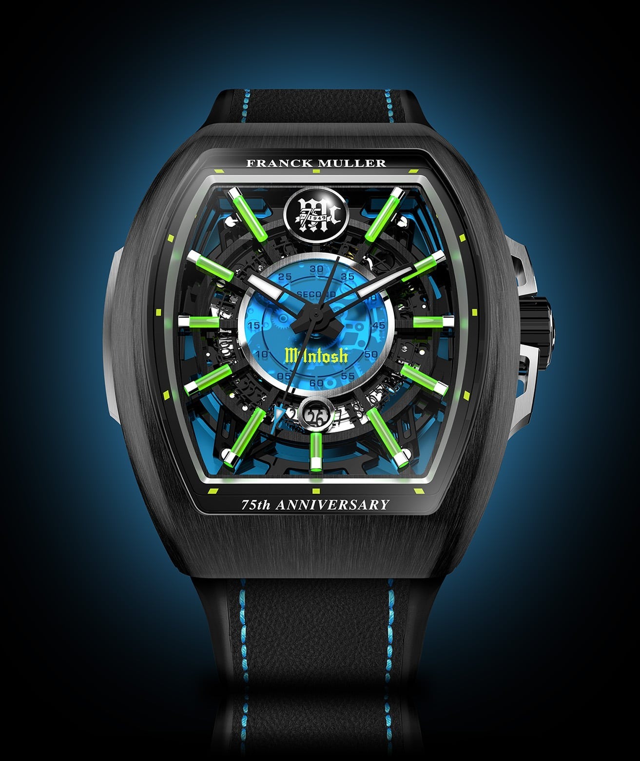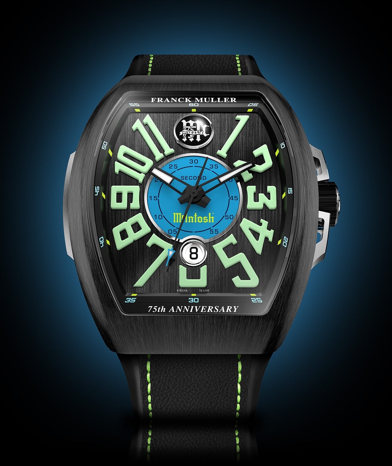 The back of the case features the McIntosh 75th Anniversary logo and the Franck Muller Geneve logo, highlighting the collaboration between the brands. Each watch is also individually numbered on the back, underlining each piece's exclusivity within its 75-piece series.