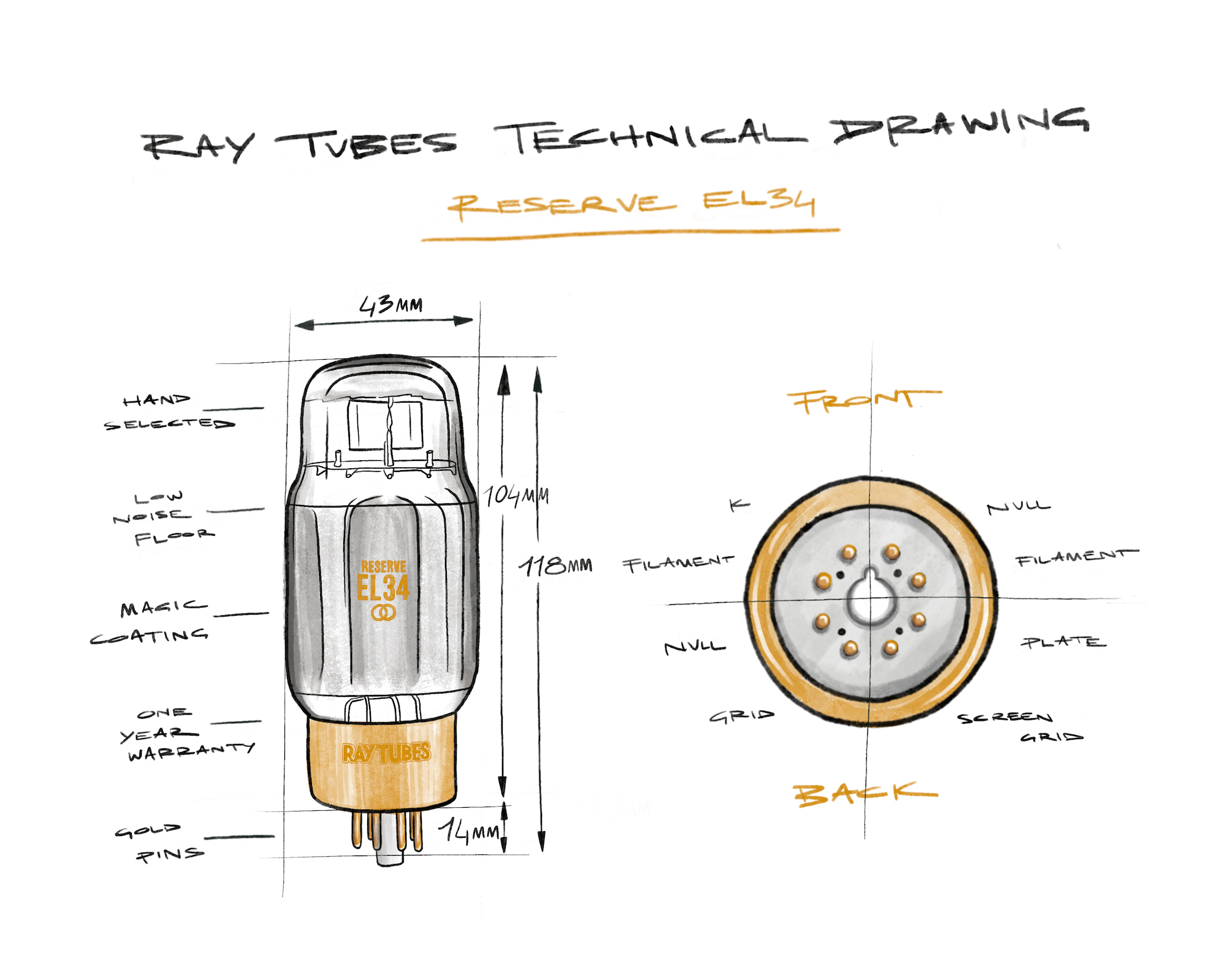 Hand selected and tested, the Ray Tubes RESERVE EL34 is designed specifically for hi-fi audio applications. Featuring gold-plated pins and our monocrystalline carbon Magic Coating, the RESERVE Collection easily outperforms New Old Stock and new production alike. Fewer than 5% of production meets our standards.